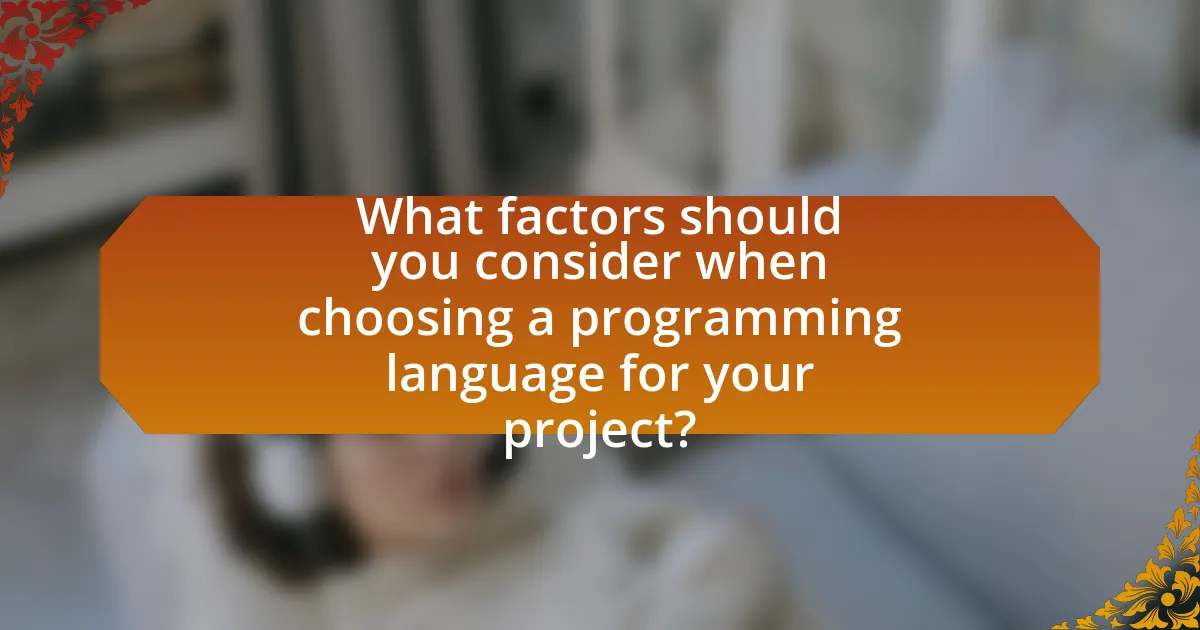 When choosing a programming language for your project, consider factors such as project requirements, performance, community support, and ecosystem. Project requirements dictate the language’s suitability based on the specific needs, such as web development, data analysis, or system programming. Performance is crucial, as some languages execute faster or are more efficient in resource usage, impacting the overall application speed. Community support is important for troubleshooting and finding libraries or frameworks, as a strong community often leads to better resources and documentation. Lastly, the ecosystem, including available tools, libraries, and frameworks, can significantly influence development speed and ease, as languages with rich ecosystems often allow for quicker implementation of features.